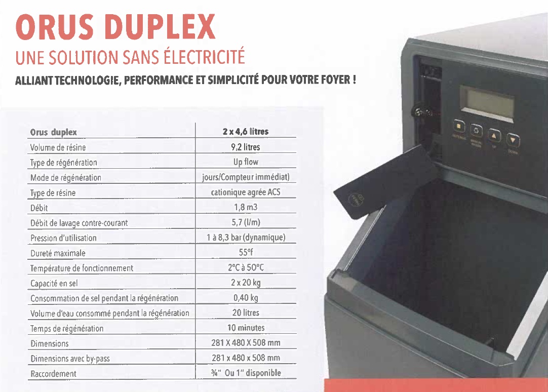 L'adoucisseur d'eau Orus Duplex est un anti calcaire efficace pour protéger vos installations. Il est compact et peut s'installer sous évier. Il est très économique et consomme 80% moins de sel et d'eau. Il fonctionne sans électricité.
